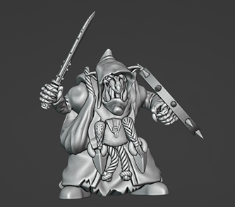 Zikhtoof is a Adamant Arsenal body, witha head from the Avatars of War Goblin Shaman on Wolf kit. He has Avatars of War hands, with a slasha (sword) and shield from free stls. VDM brush beard scalps and a free pouch round him out.