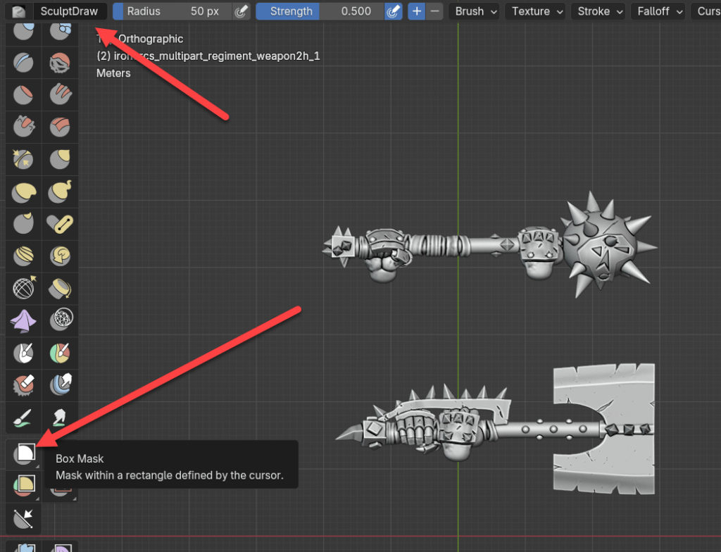 First, select the top item and switch to Sculpt mode and then select the Box Mask brush