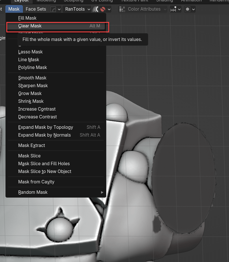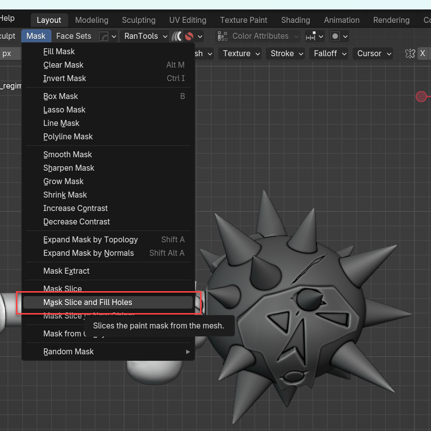 Once you have your desired cutaway area selected, select Mask-Mask Slice and Fill Holes. This will cut away the selected mesh and also ensure you don’t have openings.