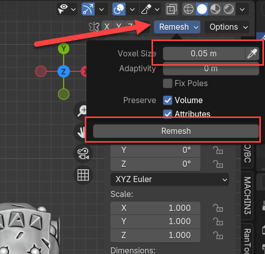 In Sculpt mode, we are going to Remesh the object. A voxel size of .05m should work. Change and hit Remesh (depending on your system, you may here the CPU spin up higher)