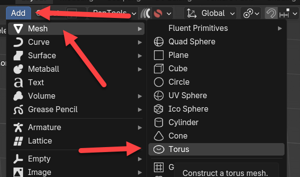Click Add, then Mesh, then Torus to add a new Torus object.