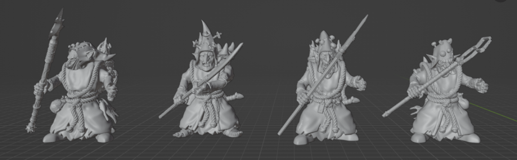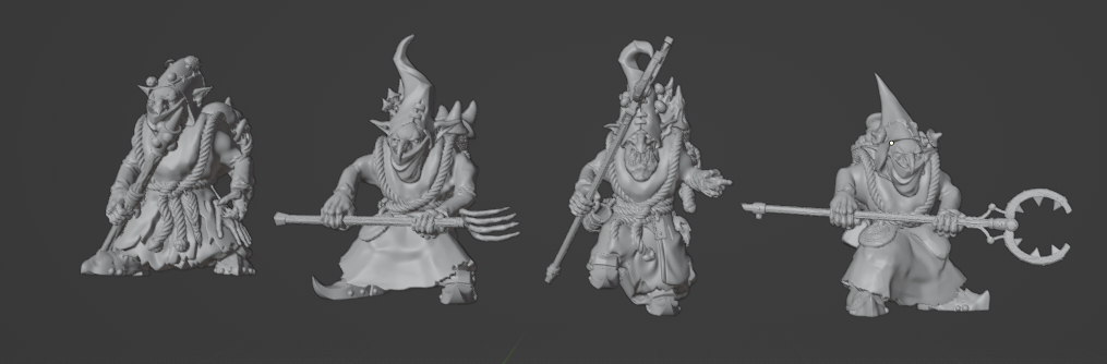 Also, it was a lot of good Blender practice making the shroom infested hats, find and modify weapons and tools that looked good for prodding, and basically do 2 versions of each one, switching out heads and some minor details to turn eight into sixteen. Hopefully enough of them for what I will use on tabletop.