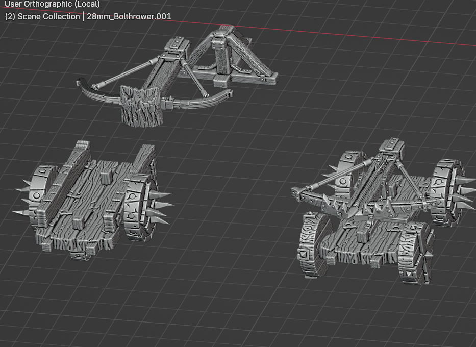 Our latest preview, is some kitbashes for goblin bolt throwas. I took parts from Highland Miniatures (Steppe Goblins), Avatars of War (Chariot, Grotlin Wagon and Flinga pieces), and some free STL models and went to town working on an eventual 6 kitbashed engines of war. These are early in the process, and I will of course show more finished kitbashes as they come together.