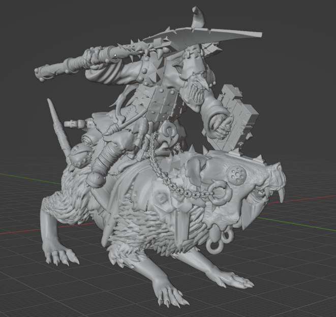 So last week, we had a preview of the 1st Night Gobbo Wolfrat Rider mount. This week, we have a look at the first (mostly) completed rat rider, mount and rider together. I really like how this came out. I will eventually have to do a lot of different versions (with and without armor, with hand weapons, no shield and bow at same time), but I’ll worry about that when I plan to print and paint.