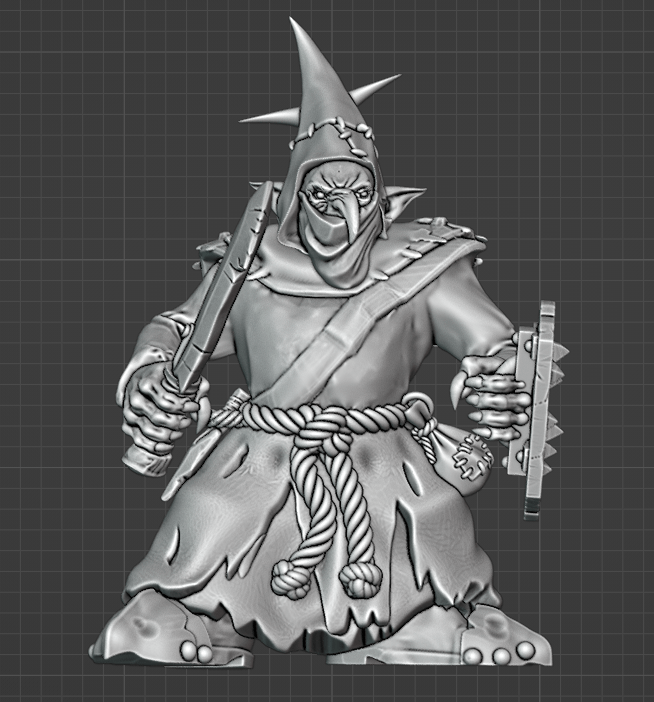 Free stl torso,Adamant Arsenal lower body, Avatars of War hands, Beholder hood, Titanforge scarf, shield and weapon, free stl trinkets. VDM eyes and nose.