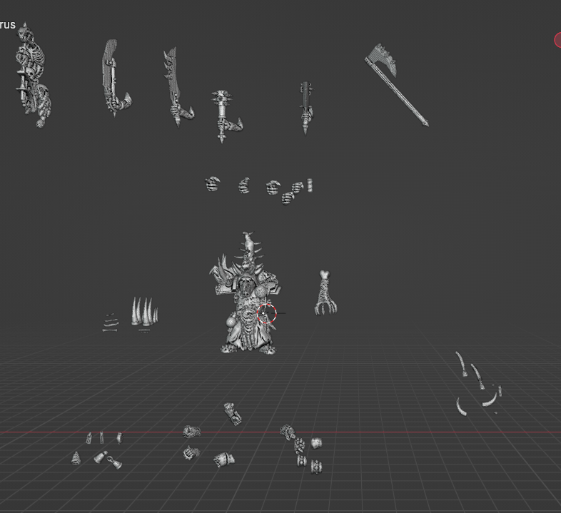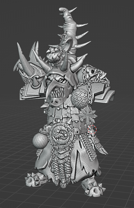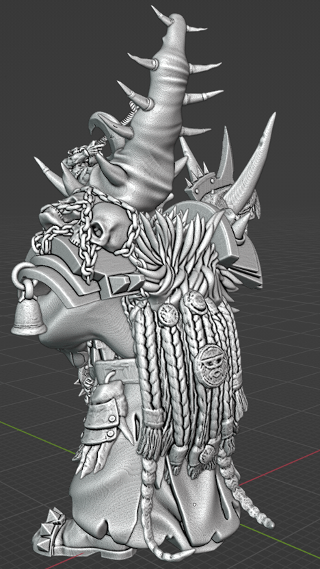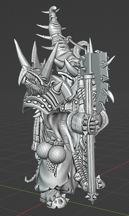 For this first version, the 2H weapon one, I used a free stl axe, but then added additional spikes, build a large rear spike and head on it, and then used gauntles taken from a free stl. I also sculpted on flame design sleeve cuffs.