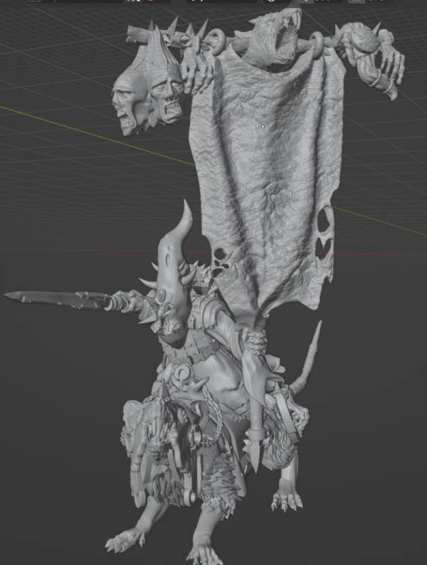 Bigspear Peltshaker holds the standard of the Wolfrat Ramblers, made from the pelt of the first wolf rat tamed by Blackhorn Teethridda. Avatars of War torso, Adamant Arsenal arms, free stl legs, Avatars of War weapons, shield, face helmet, meshed with Cankergit hood, and Titanforge mount. Free stl accessories and extra armor.