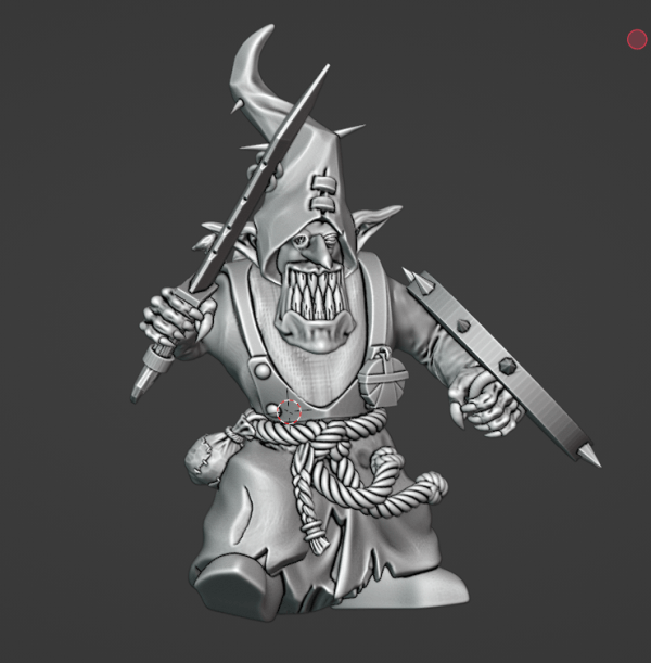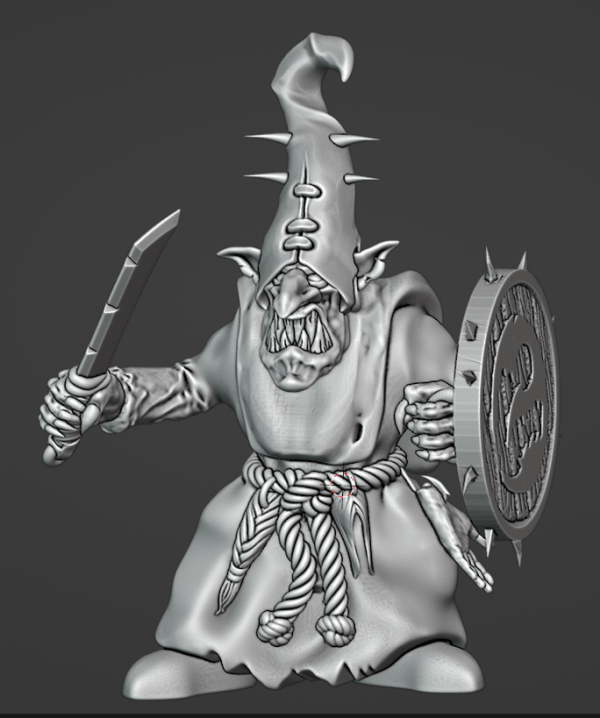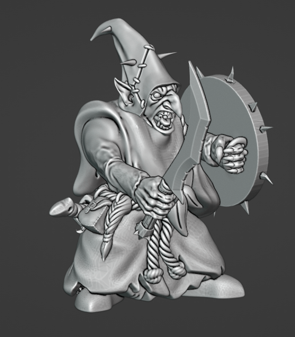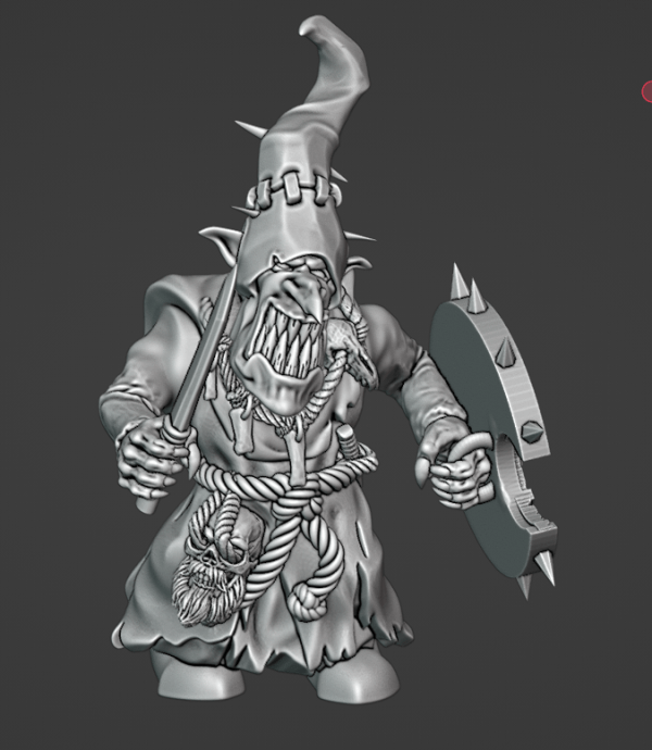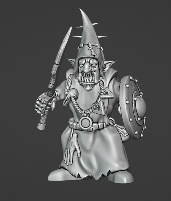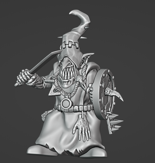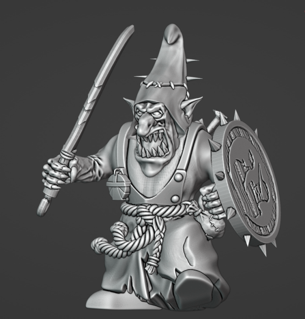 Skubgutz is a young gobbo, but moving up the pecking order fast. He will soon move up or be targeted and killed by rivals. Adamant Arsenal body, The Beholder head, Avatars of War hands, free stl weapon, shield, and accessories.